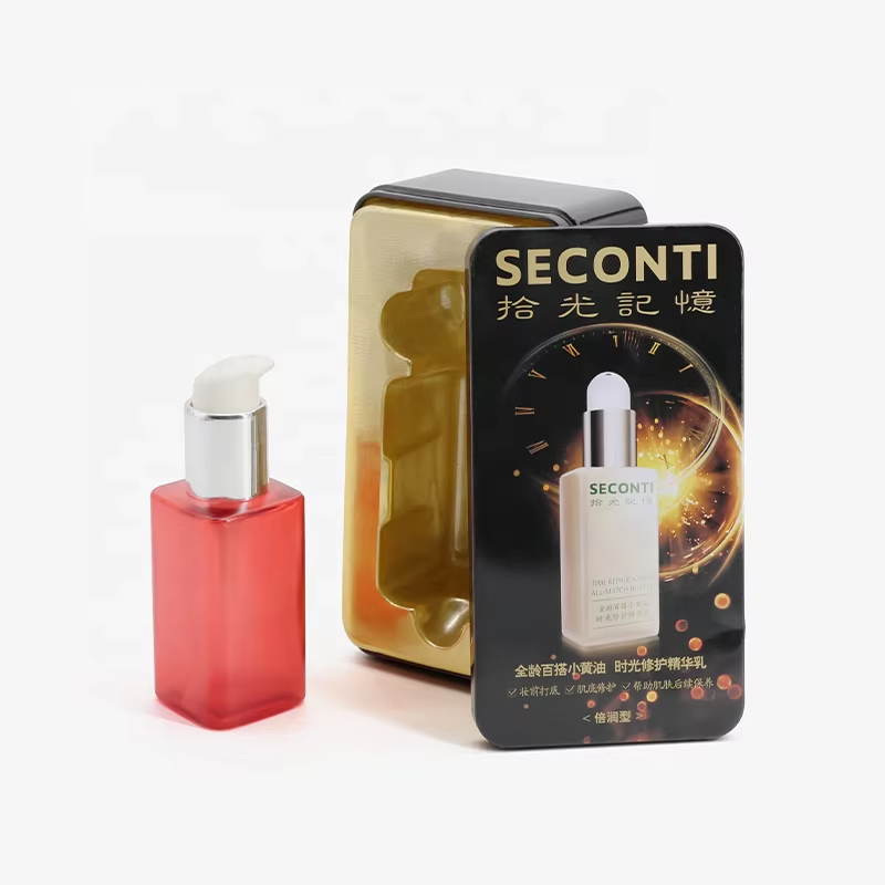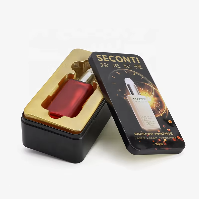 Customized Printing Tinplate Lid and Bottom Metal Box PET Insert Cosmetic Packaging Golden Tinplate Necking Rectangular Tin Box